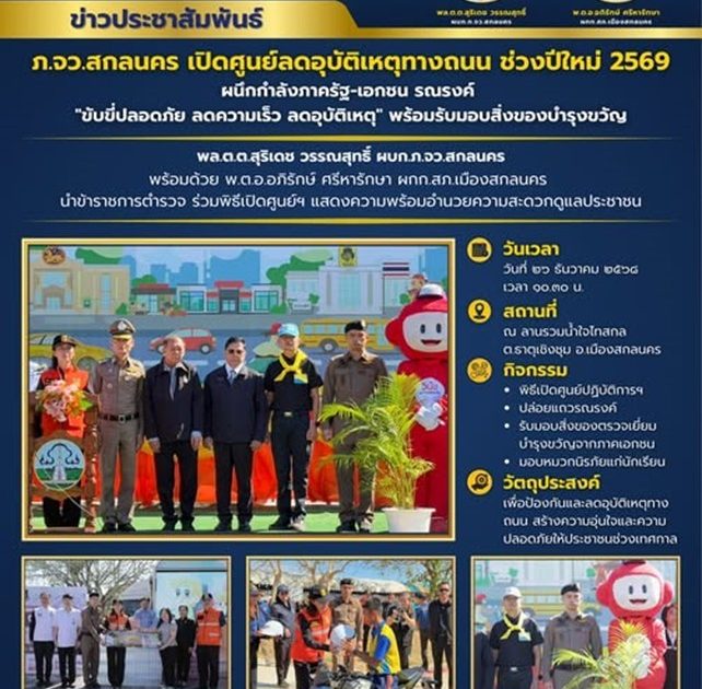 เปิดศูนย์ลดอุบัติเหตุทางถนน ช่วงปีใหม่ 2569 26 ธันวาคม 2568 โดย muangsakon / ข่าวประชาสัมพันธ์,ข่าวภารกิจผู้บังคับบัญชา