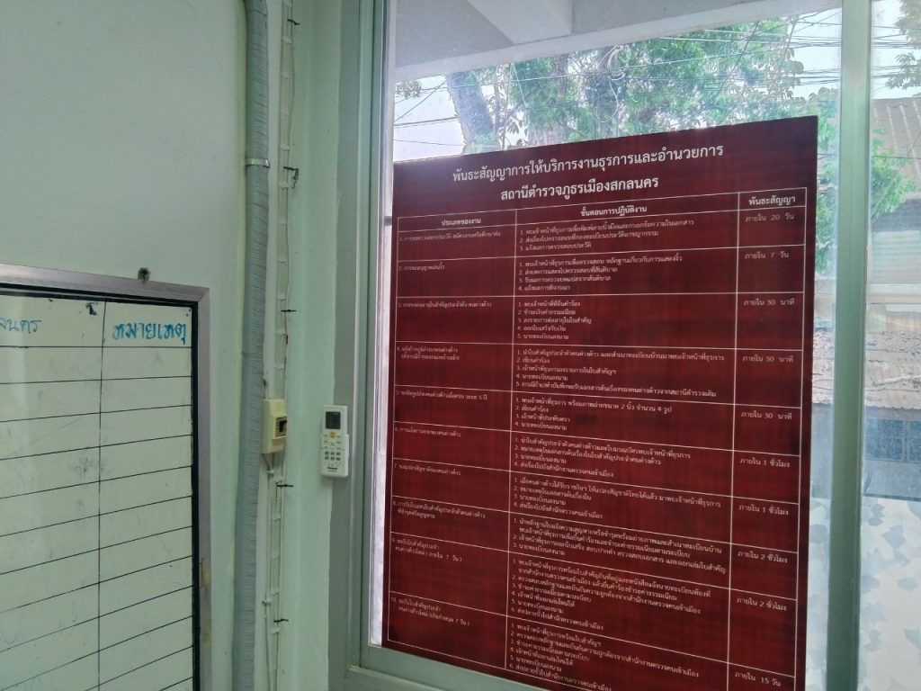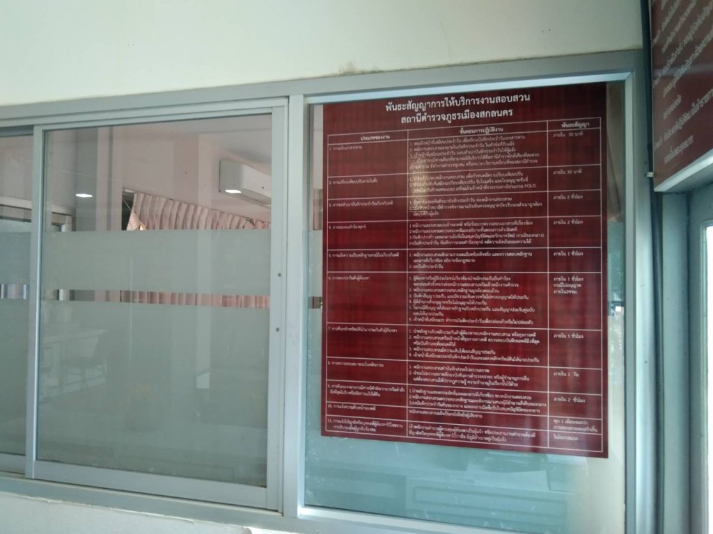 • ติดไว้ในจุด บริการของสถานี เพื่อให้ประชาชนทราบว่า หน่วยงานประกาศว่าเจ้าหน้าที่ทุกคนในสังกัดไม่รับของขวัญหรือของกำนัลจากการปฏิบัติหน้าที่ และต่อต้านการรับสินบน โดย มี พ.ต.อ.ชัชวาลย์ ดวงแก้ว ผกก.สภ.เมืองสกลนคร หัวหน้าหน่วยงานประกาศ
